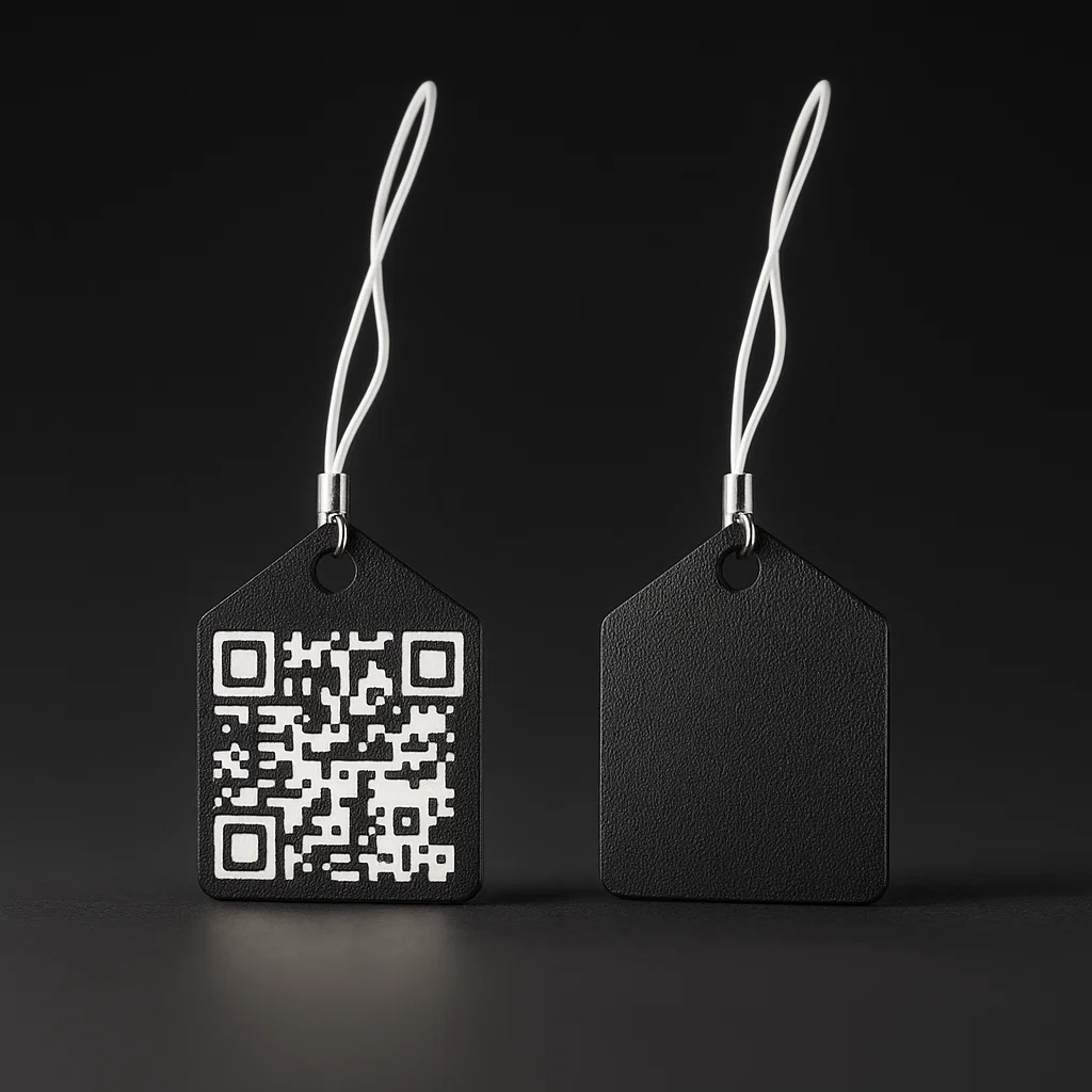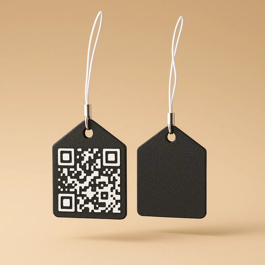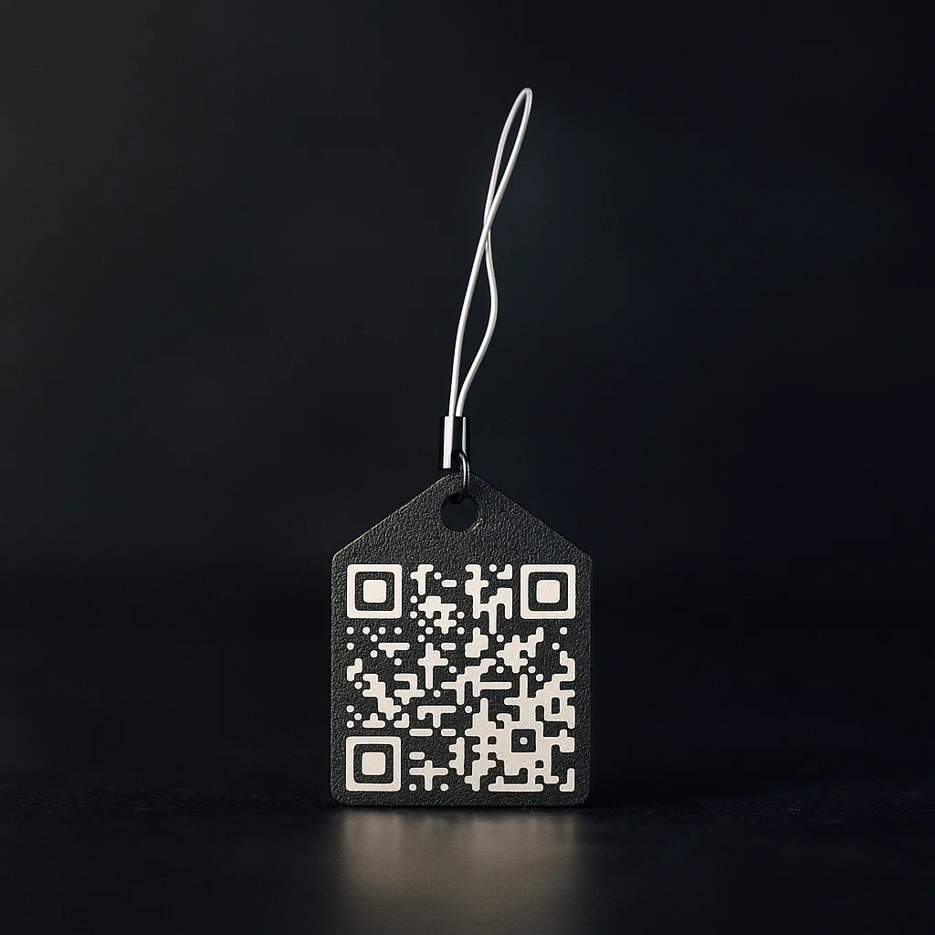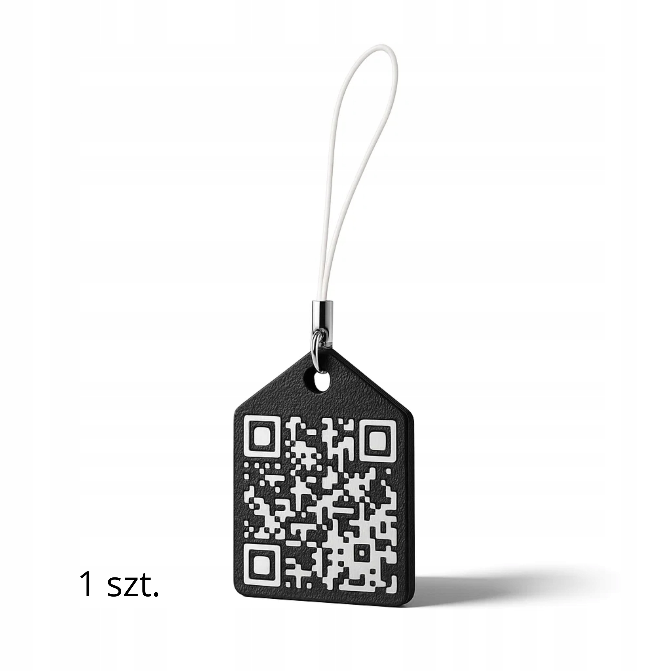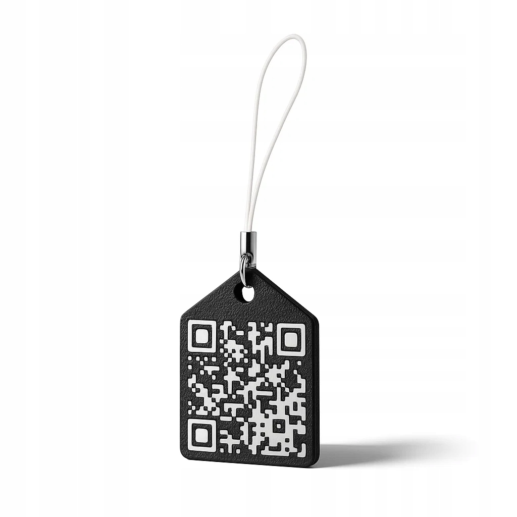 Stylowy brelok z kodem QR wykonany z trwałego czarnego tworzywa, z wyraźnym białym nadrukiem na froncie i gładkim tyłem. Wyposażony w biały sznurek i metalowe kółeczko, które pozwalają przypiąć go do kluczy, etui na telefon, plecaka, torebki czy smyczy identyfikacyjnej.