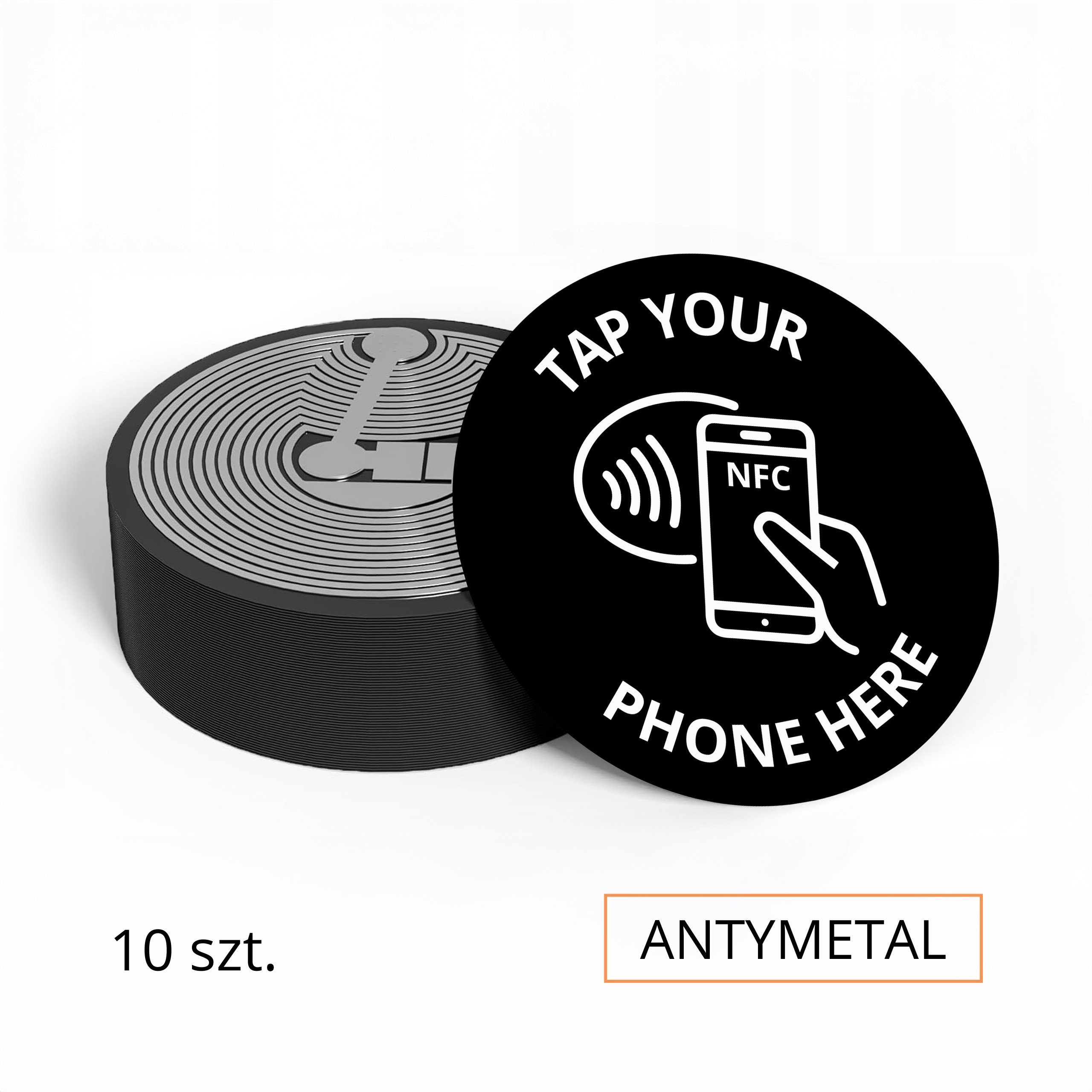 Czarne antymetalowe naklejki NFC „TAP YOUR PHONE HERE” – wersja angielska