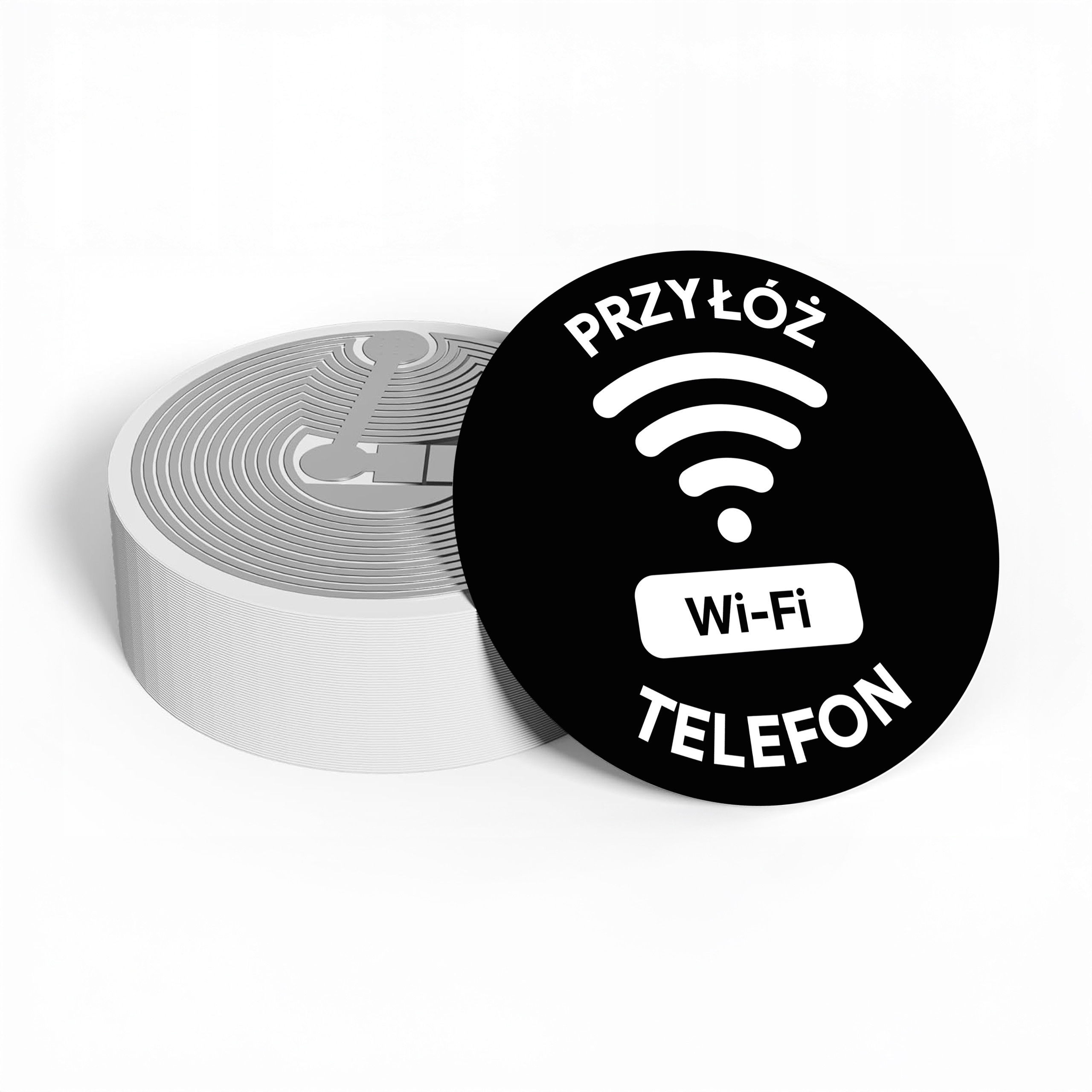 Zestaw 10 sztuk samoprzylepnych tagów NFC NTAG213 z nadrukiem „Przyłóż telefon – Wi-Fi” to praktyczne rozwiązanie dla apartamentów, kawiarni, hoteli i biur. Po zaprogramowaniu tagu użytkownik może uzyskać dane logowania lub – w przypadku Androida – automatycznie połączyć się z siecią.