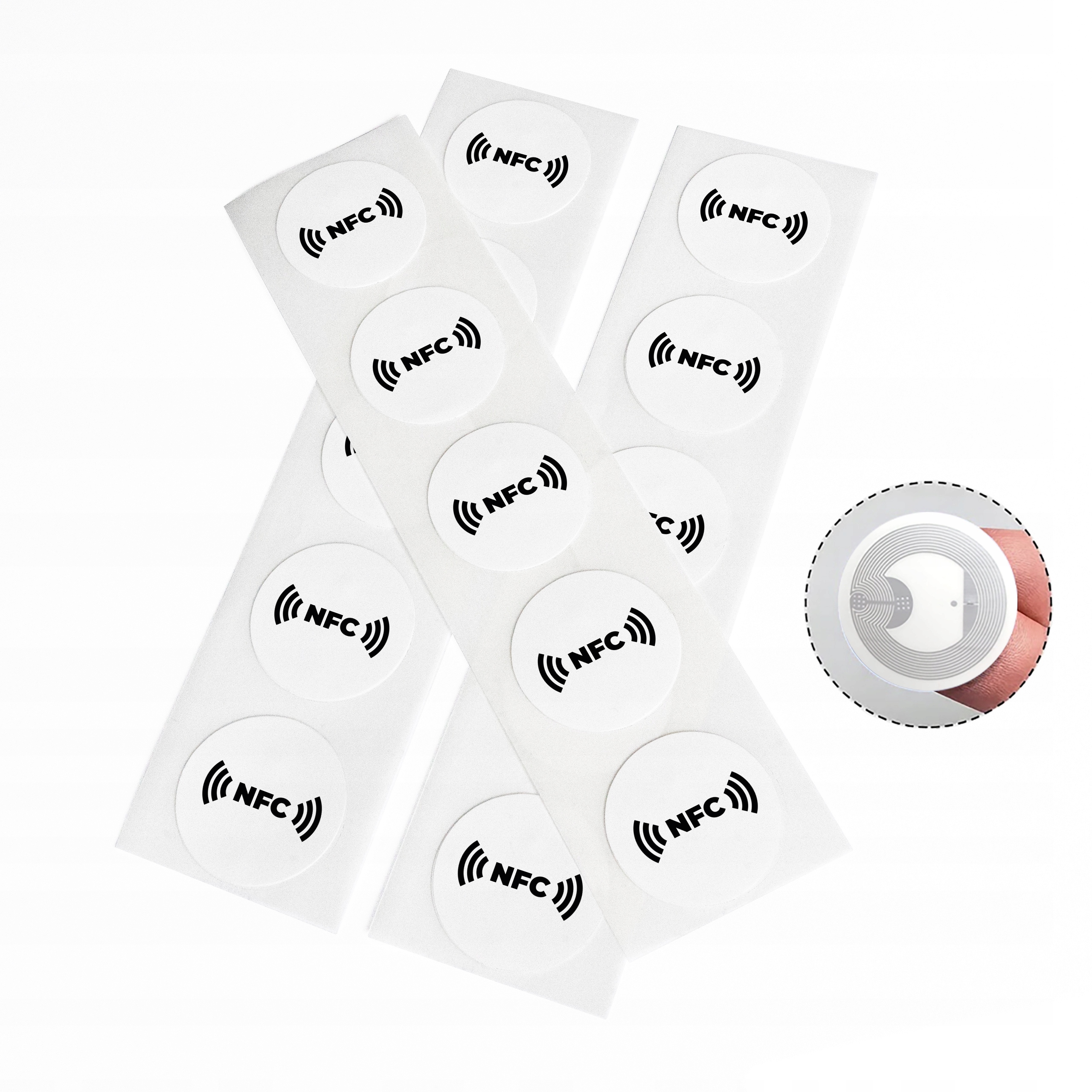 W komplecie znajduje się 10 sztuk tagów NFC bez ferrytu z trwałą, białą naklejką z napisem „NFC”. Każdy tag jest gotowy do zaprogramowania – możesz przypisać do niego dowolny link lub funkcję, np. stronę internetową, profil Google, menu online, płatność lub wizytówkę NFC.