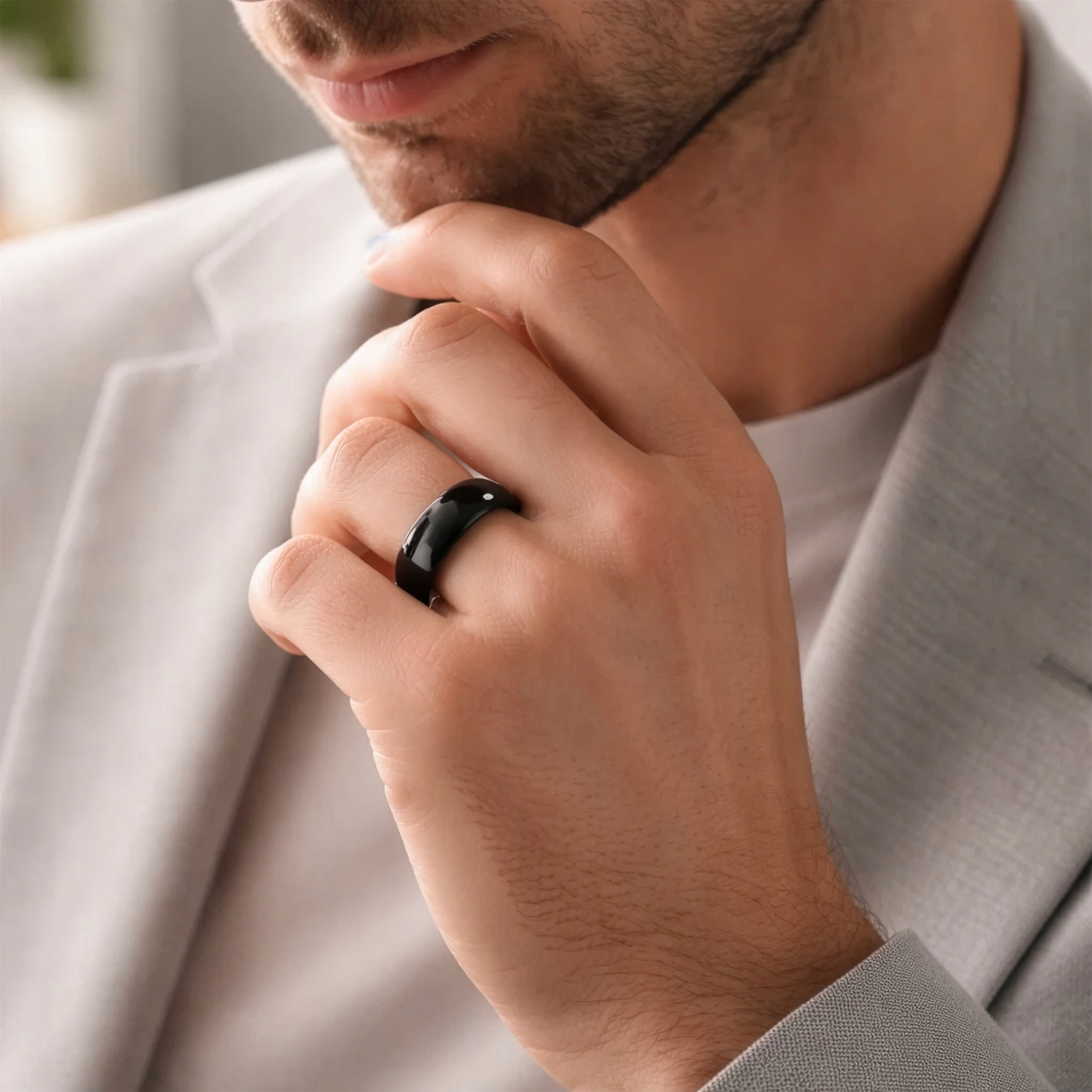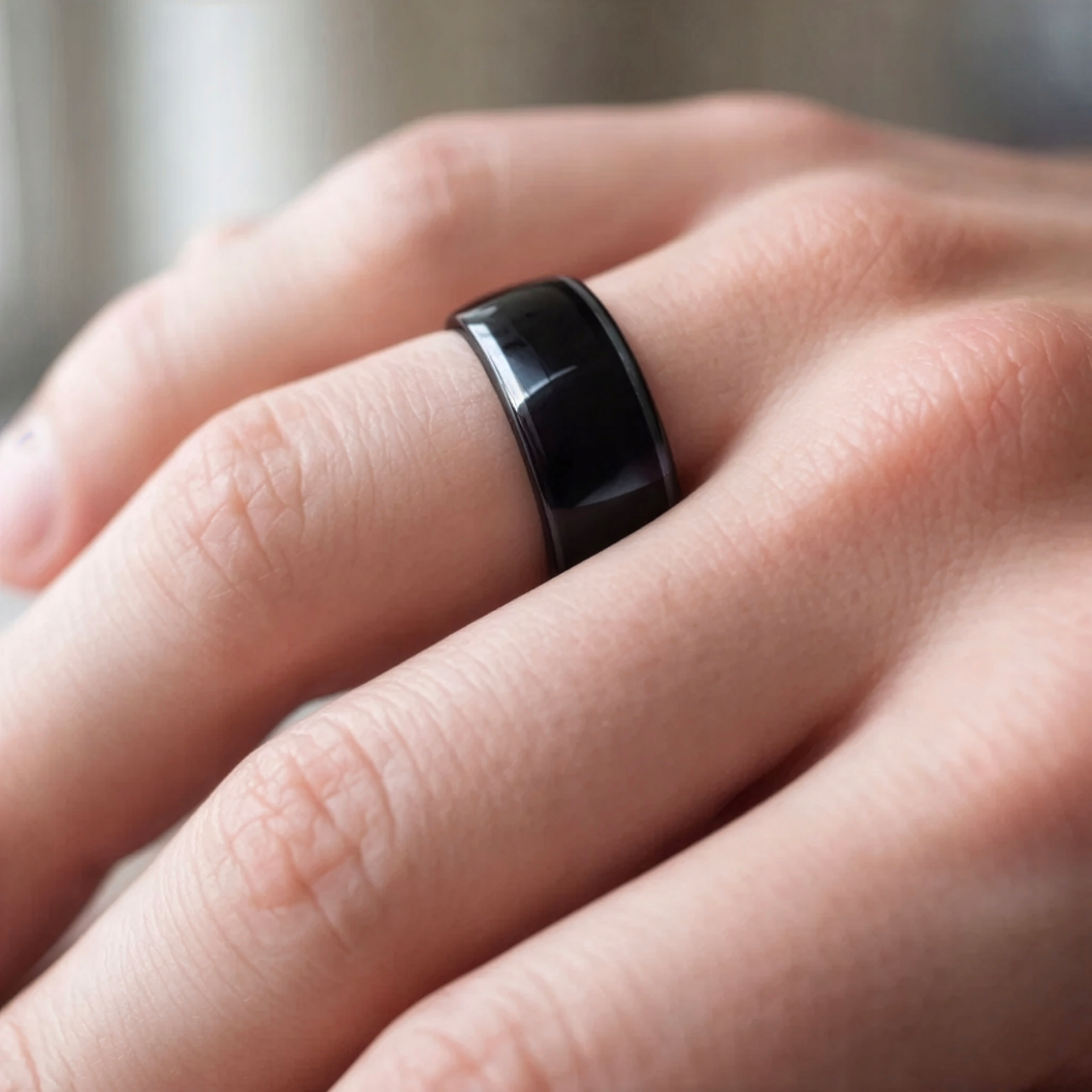 Ceramiczny pierścionek NFC z chipem NTAG215, działa bez baterii i bez ładowania, jest wodoodporny, współpracuje z Android i iOS i pozwala udostępniać informacje jednym zbliżeniem do telefonu.